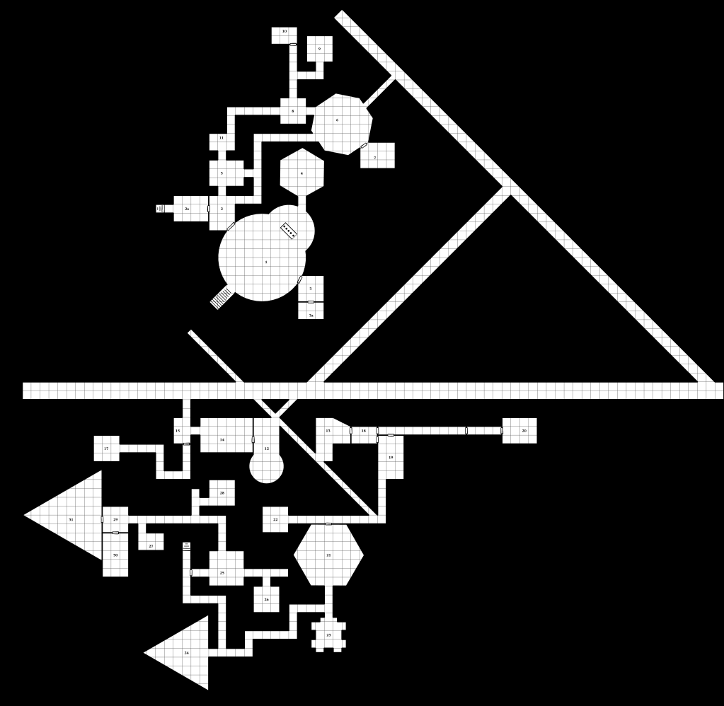 To facilitate under taking such a project I decided to spend the first day of the month on creating a layout of a floor with a number of rooms equal to the days in that month as well as the first room description to help make sure everything flows together as a coherent concept. I chose to set this in my home setting (which I hope to talk a lot more about on this blog in the coming weeks, in the undercity of the city of Myrath which has been used as the home base for several dedicated campaigns and my open table. It’s an ancient city with a rich history that lends itself to having an expansive underworld of ruins, crypts, sewers, and forgotten basements. I’m sure this complex will be expanded upon as time goes on and I have more ideas for it as well but it’s a good basis for a relaxation project worked on one day at a time. I also decided that I would be developing this to be as system agnostic as possible so it could be run using any old school fantasy roleplaying system. So even though I will be writing up certain statistics based on the 1974 Edition feel free to replace them with whatever makes sense for the system you’re using.