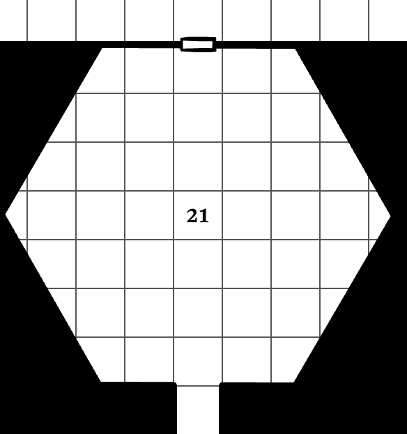 Area 21: Entrance Hall to the Vaults: This area is entered through a heavy stone door on the northern side. All six walls are lined with remains of statues of humanoid figures that have been smashed to bits and a cold haze hangs in the air. Graffiti in some ancient, long forgotten tongue is scribbled on the southern wall.