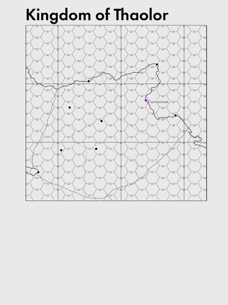 In this system hexes have three types: world (30 miles), regional (6 miles), and local (1.2 miles). This gives us world hexes with an area of roughly 780 square miles, regional hexes with an area of roughly 31 square miles, and local hexes with an area of roughly 1 square mile. Each world hex will consist of 19 whole and 12 half regional hexes, (the same goes for the number of local hexes a regional hex contains. If we wanted to go further we could break down the local hexes into an equal amount of roughly quarter mile “subhexes” with an area of roughly 14 hectares but I have seen no general reason to do this as of yet.