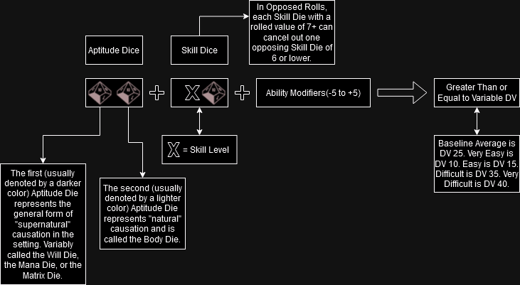 The first 2d10 are the Aptitude Dice which consist of the “supernatural” causation die (the Will Die, the Mana Die, the Matrix Die, etc.) and the “natural” causation die (the Body Die). These Aptitude Dice represent the fact that any player character has some level of baseline skill regardless of their level of training in a specific field. The “supernatural” causation die represents the “animating force” that pervades a setting (the net, the quintessence, the spiritus mundi) and the “natural” causation die represents the baseline physical capability of a player character. Rolling 1s and 10s on these dice can have varying effects on the results depending on the specific game system/setting and the specific sort of check (for example a 1 on the Mana Die when rolling to cast a spell could increase a pc’s corruption by demonic forces).